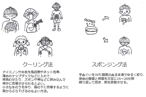 暑くない部屋で薄着にして,水分の補給を心がけましょう。そして背中,腋下,そけい部(大腿のつけ根)などをゆっくりと冷やします。具体的には,アイスノンや氷まくらをタオルでくるんだものを背負わせます。小さな氷のうを作り,両肩からぶら下げて腋下を冷やすのもよい方法です。また,スポンジング法といって,30℃程度のぬるま湯でゆるくしぼった手ぬぐいで体の腹面と背面を交互に10~20分間くり返して拭き,熱を放散させる方法も有効です。